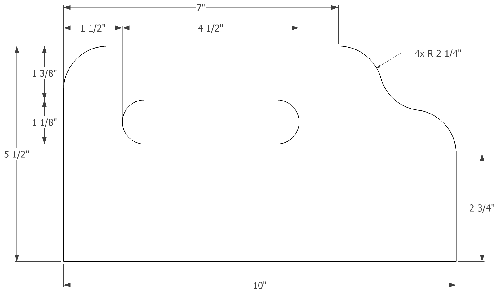 I made my first one in around 2000 after tracing one of John’s examples. I later cleaned it up a bit and made a template from scratch, laying it out on some 1/2″ Baltic birch plywood. The 1-1/8″ radii in the corners may seem like an odd dimension, but that’s the largest radius I have on my circle template. It works. Anything in that range will work.